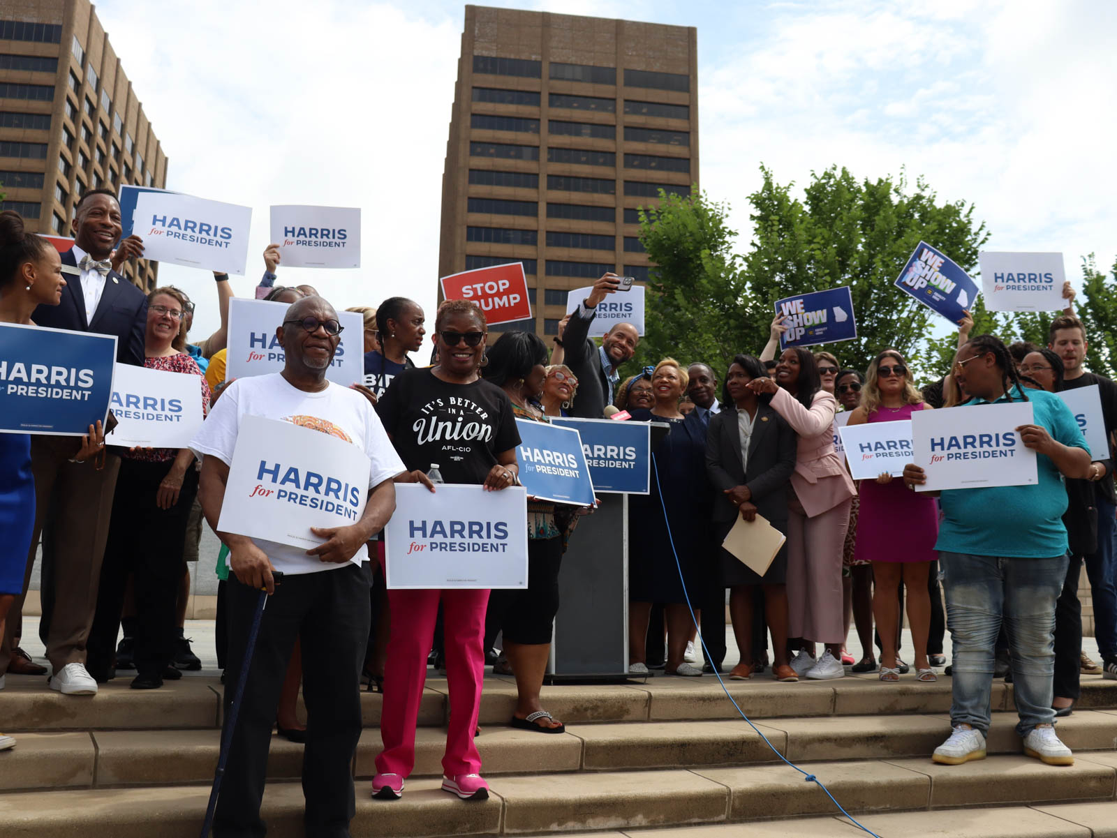 Rally speakers emphasized that Georgia is in play as a key battleground state, since Democratic voters flipped its U.S. Senate races blue by electing Sens. Jon Ossoff and Raphael Warnock. Fulton County Commission Chair Robb Pitts said Democrats are ready to propel their candidates to victory again in November.
