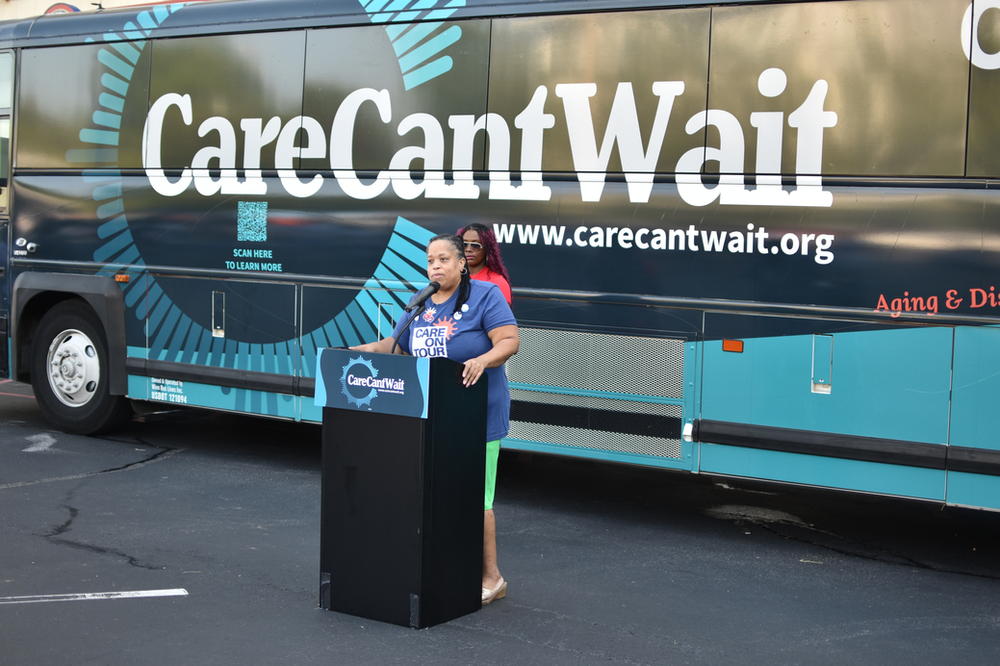 Lamar, who lives in Covington, is a member of the National Domestic Workers Alliance—part of the Care Can’t Wait Coalition, a group of advocacy organizations and unions that sponsored the bus tour. She got into care work while looking after an aging grandmother.
