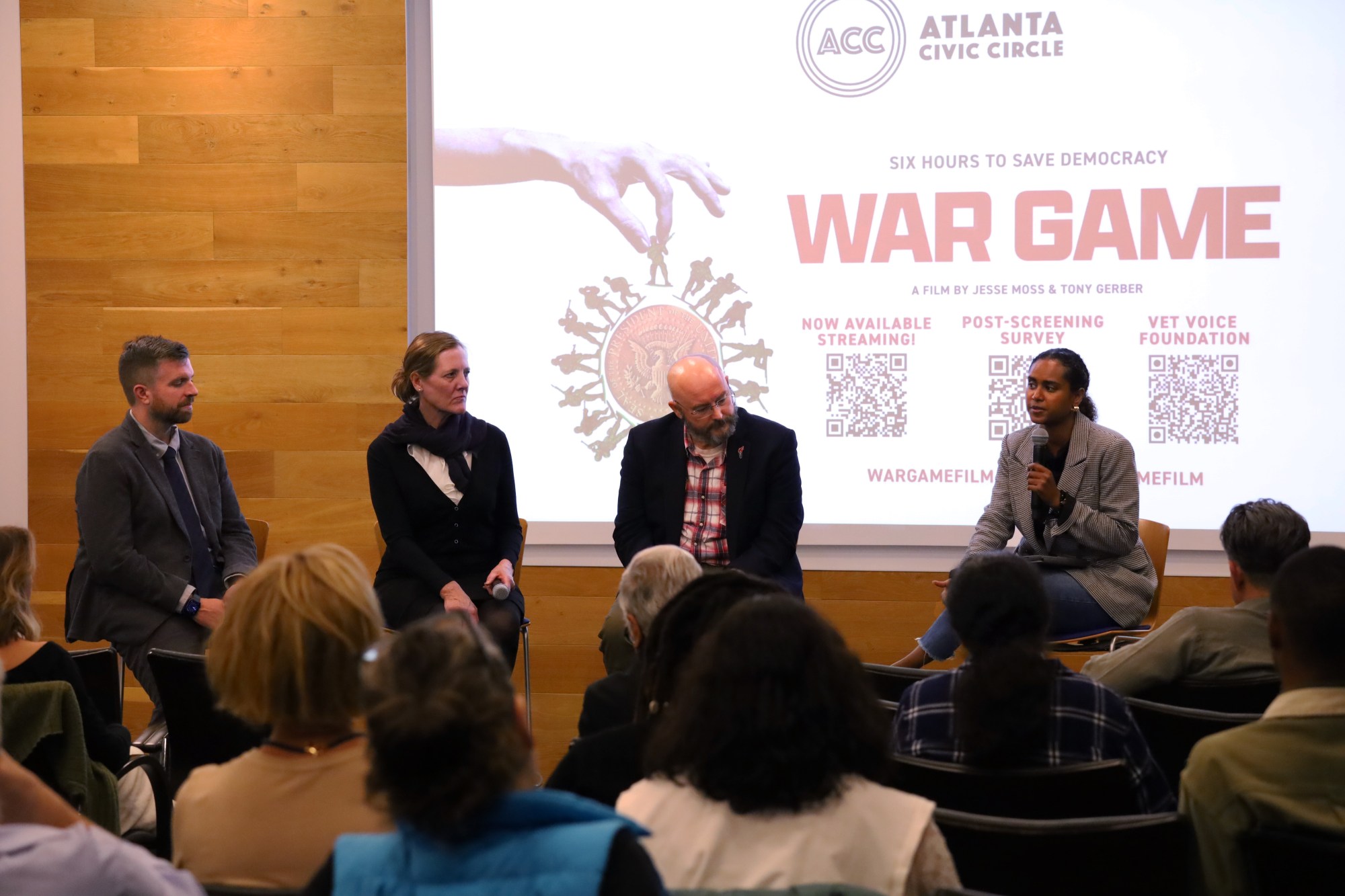 Last night, Atlanta Civic Circle hosted an engaging panel discussion following a screening of the powerful documentary “War Game.” The film set the stage for a conversation on safeguarding democracy — featuring unique insights from our panelists Kathleen Hamill, Chris Purdy, and Scot Turner.