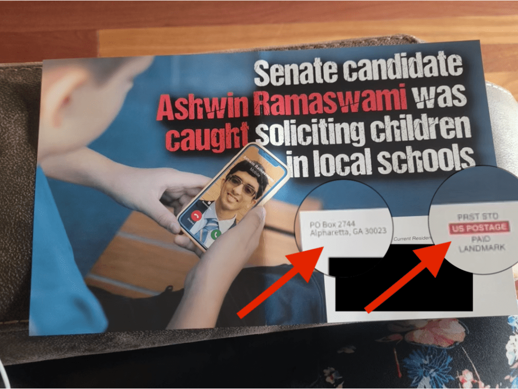 For several of the mailers attacking Ramaswami, the indicia bore the name “LANDMARK,” and the return address was a P.O. box in Alpharetta. When asked for the sender’s identity, the Alpharetta postmaster could determine only that the LANDMARK indicia was not registered to the Alpharetta postal branch. A US Postal Service spokesperson recommended making a Freedom of Information Act request (that can take up to 20 business days to fulfill), which Atlanta Civic Circle has submitted.
