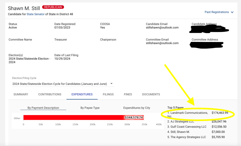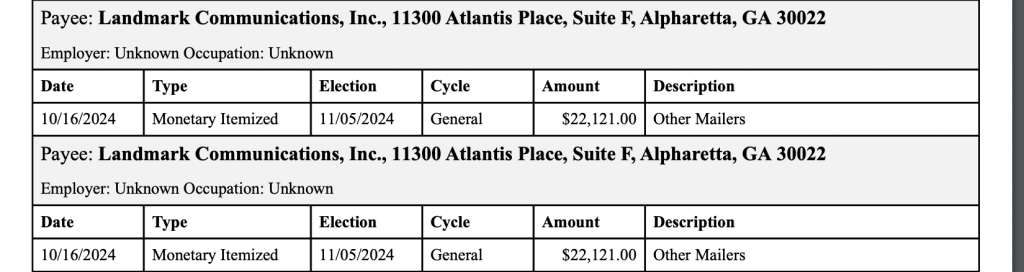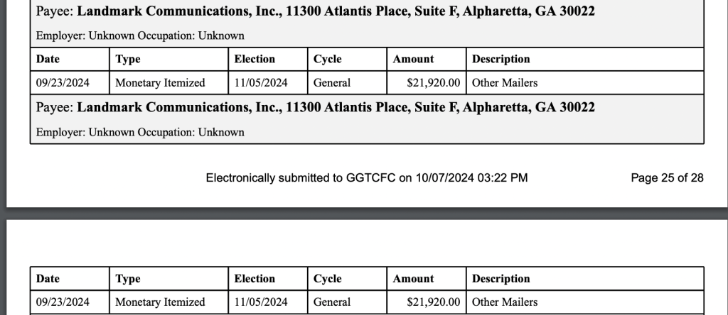 However, Landmark Communications is listed as Still’s top payee in his financial disclosure report to the Georgia Campaign Finance Commission. Still’s campaign had paid over $174,000 to Landmark Communications as of Oct. 19, the most recent disclosure filing date. The disclosures indicate seven payments for mailers, totalling $139,000 between Sept. 23 and Oct. 21.
