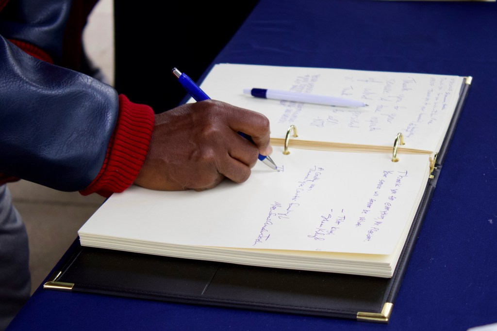 Visitors sign the guest books at the Carter Center, leaving personal messages to honor Carter’s legacy. (Photo/Claire Becknell)
