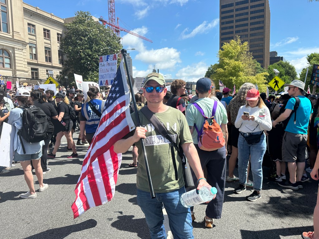 Colt Harwell, a cybersecurity professional and U.S. Air Force Veteran in his thirties who toted an American flag at the downtown event, blasted Lady Gaga out of portable speakers. He said it was his first time going to a demonstration, too.