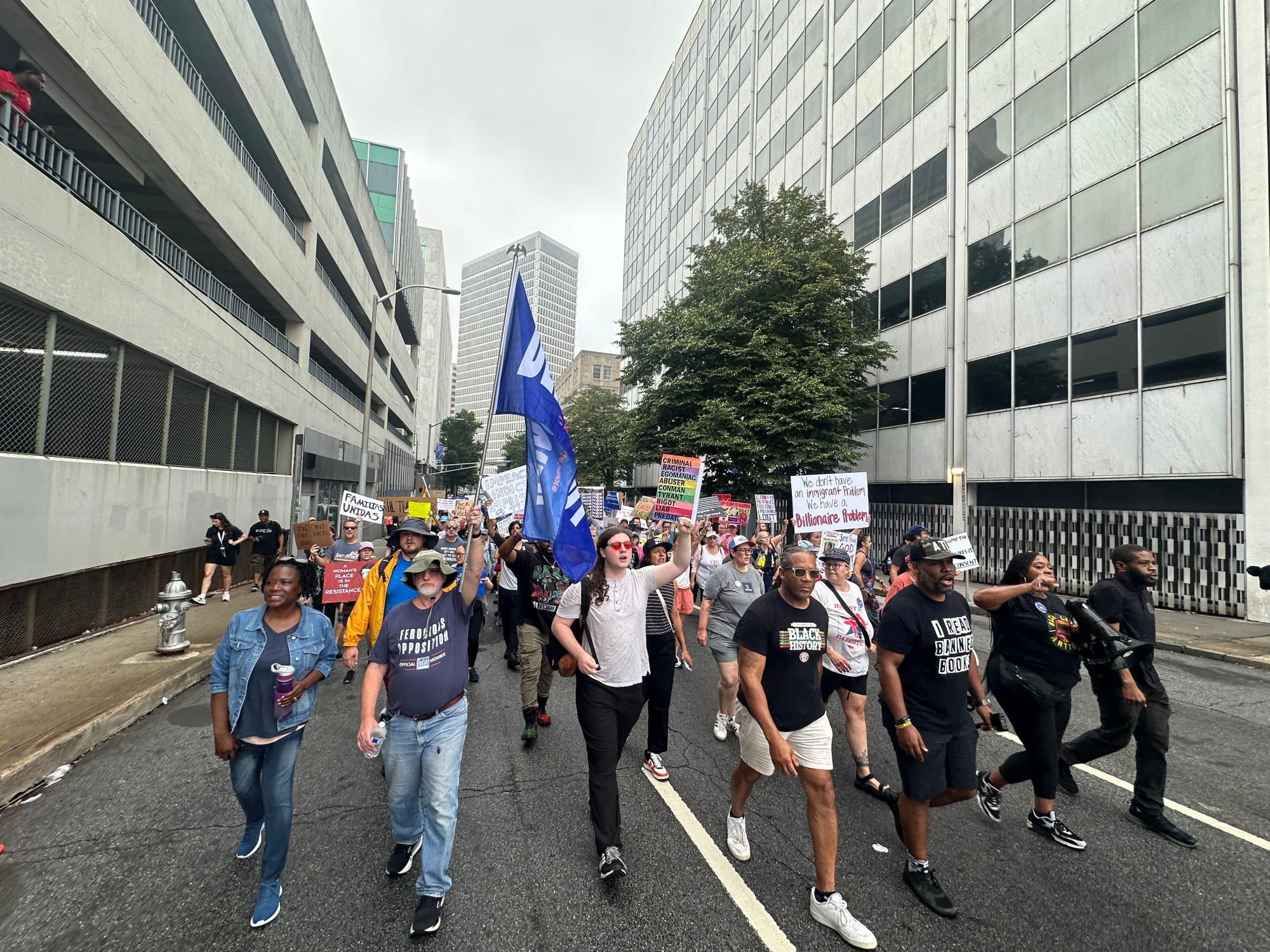 The demonstration, organized by the progressive group 50501, began at the Martin Luther King Jr. National Historical Park and proceeded down Auburn Avenue to Big Bethel AME Church,  concluding at the Atlanta ICE Field Office.