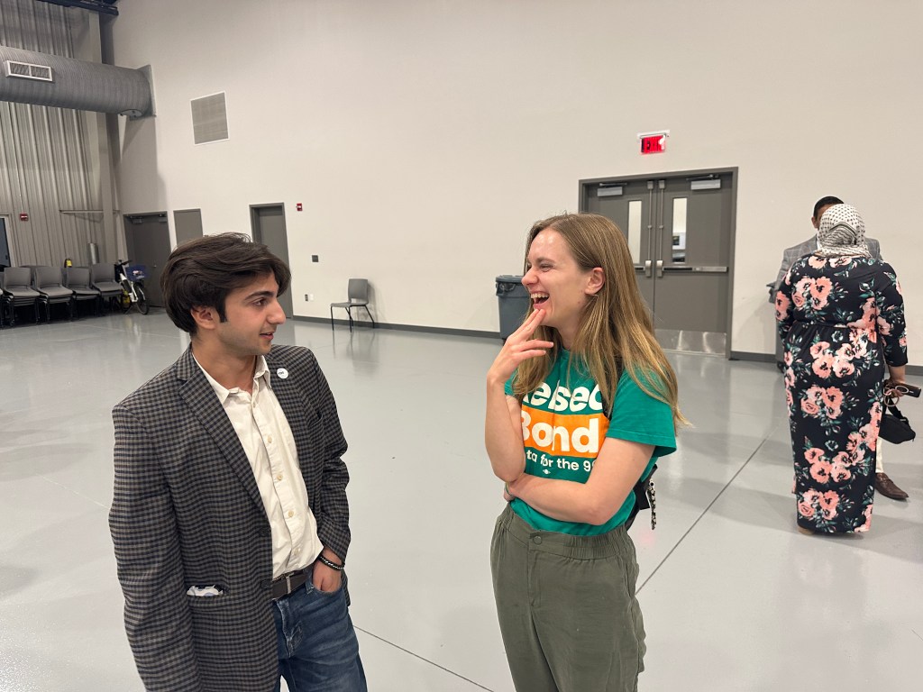 Ali Akbar and Kelsea Bond chatting at the sidelines of the Benefits Over Billionaires rally. Credit: Alessandro Marazzi Sassoon