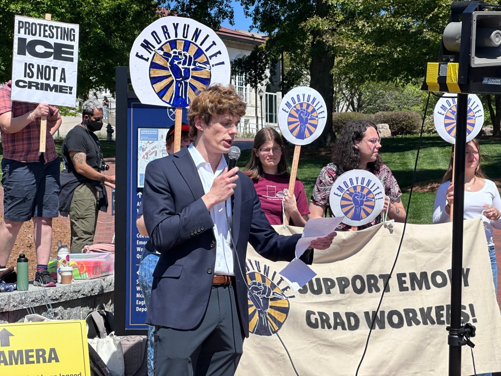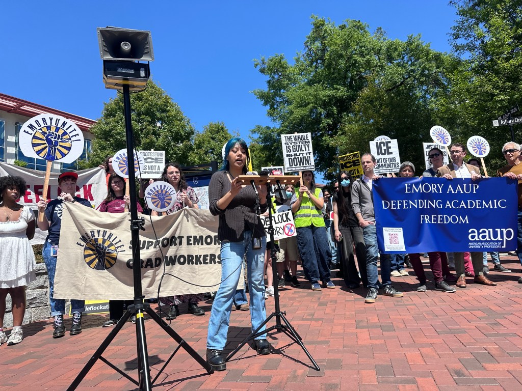 “If I stay silent, who gets saved? Nobody,” said Ramos. “The cameras stay up, the database keeps running, ICE keeps getting fed, and the next undocumented worker at Emory wakes up tomorrow just as scared as I am,” she said, hands trembling, as she addressed a crowd of over 100 students, faculty, and staff protestors at Asbury Circle on Emory’s campus before they delivered their demands to the university.