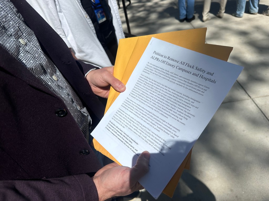 A broad alliance of student and faculty groups delivered a petition with nearly 1,000 signatures to Emory University on Friday, demanding it cease using Flock Safety license-plate readers to record vehicles on campus and initiate a community-led review of campus surveillance practices.